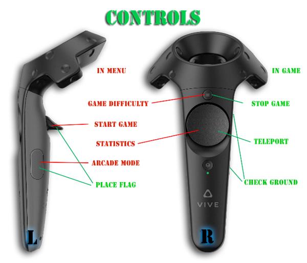 玩家需要使用Vive的控制器实现操作,开始、暂停、进入菜单等等都要使用左右手的两个控制器,可以检查地面放置疑问旗和确认并插入雷旗。