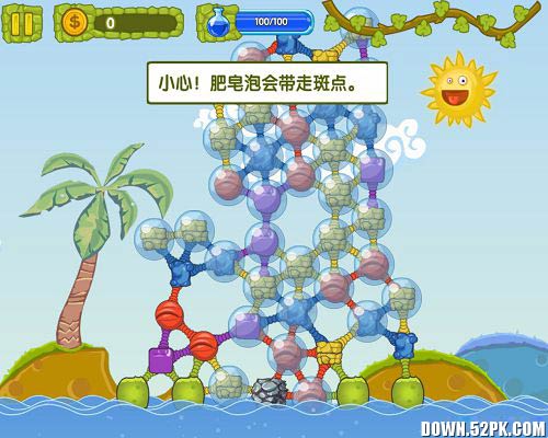 游戏的画面以及色彩给人一种在玩《粘粘世界》的感觉,不过这货真的不是粘粘世界。不同的颜色小球会从屏幕上方出现,然后相邻的小球生长出触手(囧)聚集在一起,玩家只要用手指点击聚集了两个以上同色小球的区域,就能将它们消除。不过游戏仅仅是这样子的话就弱爆了。游戏的过关要求是让上方的藤条上出现足够数量的小怪物,小怪物要由5个或5个以上同色的小球聚合而成,当变身出小怪物之后,还要再利用一次同色消除才能成功收集。
