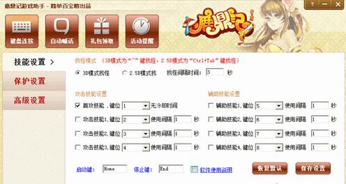 鹿鼎记游戏助手是简单百宝箱针对鹿鼎记游戏专用的一款键盘连按工具。它带有选择目标组合键,也是游戏选择目标的默认键,通过简单几个按键设置,即可实现自动选择目标、自动释放技能等功能。甚至有死亡报警、验证报警和自动捡物等高级功能,方面玩家的使用!