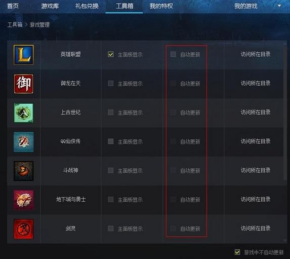 自动更新可以使TGP自动帮您检测游戏客户端是否需要更新。如果需要更新的话,TGP会在您网络空闲时,自动帮您更新游戏,使您在每次游戏时都是最新的版本。设置“自动更新”的方法如下: