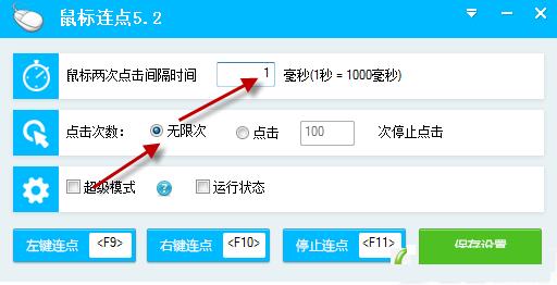 3、支持设置连点的间隔时间,最大为1毫秒,理论上每秒可连点1000次,让你轻松玩转游戏,再也不会手疼了。