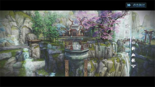 选择好人物角色,就跟着动画进入剧情的开始。如果没有右上角的点击跳过,小编真以为开错了软件,游戏内的画面美如画,水溪潺潺流动,山间雾气弥漫,小桥夸瀑横卧,竹林花海亭下,传说中的仙境应该就是如此了吧。