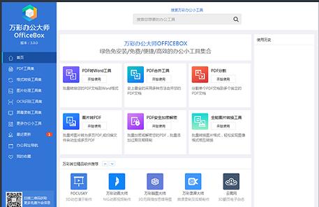 万彩办公大师内置了60多款强大的,无任何广告及插件的绿色办公组件,如PDF工具集(PDF转Word,PDF合并分割水印),文档/音视频/图片转换工具集,非常好的一款办公软件,你值得拥有!